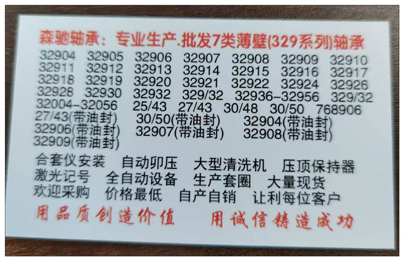 型號:32904、32905、32906、32907、32908、32909、32910、32911、32912、32913、32914、32915、32916、32917、32918、32919、32920、32921、32922、32924、32926、32928、32930、32932、329/32、32936-32956、323/32、32004-32056、25/43、27/43、30/48、30/50、768906,27/43(帶油封)、30/50(帶油封)、32904(油封)、32906(油封)、32907(油封)、32908(油封)、32909(油封)