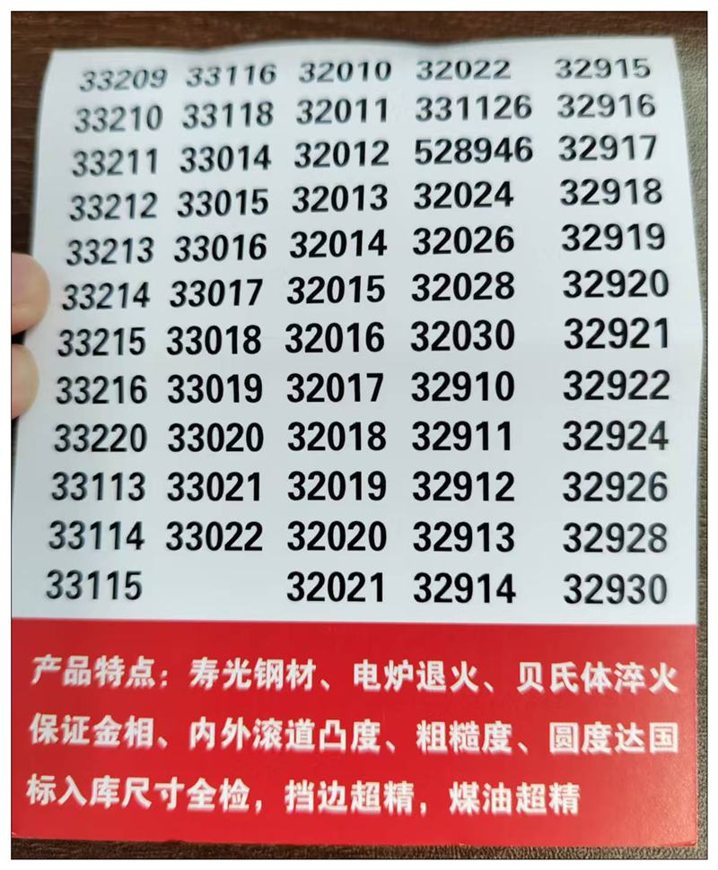 型號(hào):33209、33210、33211、33212、33213、33214、33215、33216、33220、33113、33114、33115、33116、33118、33014、33015、33016、33017、33018、33019、33020、33021、33022、32010、32011、32012、32013、32014、32015、32016、32017、32018、32019、32020、32021、32022、331126、528946、32024、32026、32028、32030、32910、32911、32912、32913、32914、32915、32916、32917、32918、32919、32920、32921、32922、32924、32926、32928、32930